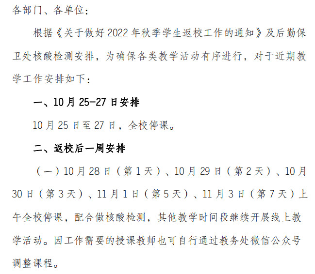 关于2022年秋季学生返校期间及近期教学工作安排的通知